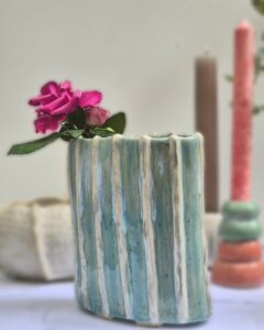 Steinzeug ist ein hochwertiger Ton, der mit feinen Mineralien gemischt und bei hohen Temperaturen gebrannt wird. Er ist besonders widerstandsfähig und langlebig. Jedes Stück ist ein Unikat, von Hand getöpfert. Nach dem Schrühbrand werden die Tonscherben mit hochwertigen glasierenden Farben bemalt und im Anschluss bei 1240 Grad gebrannt.